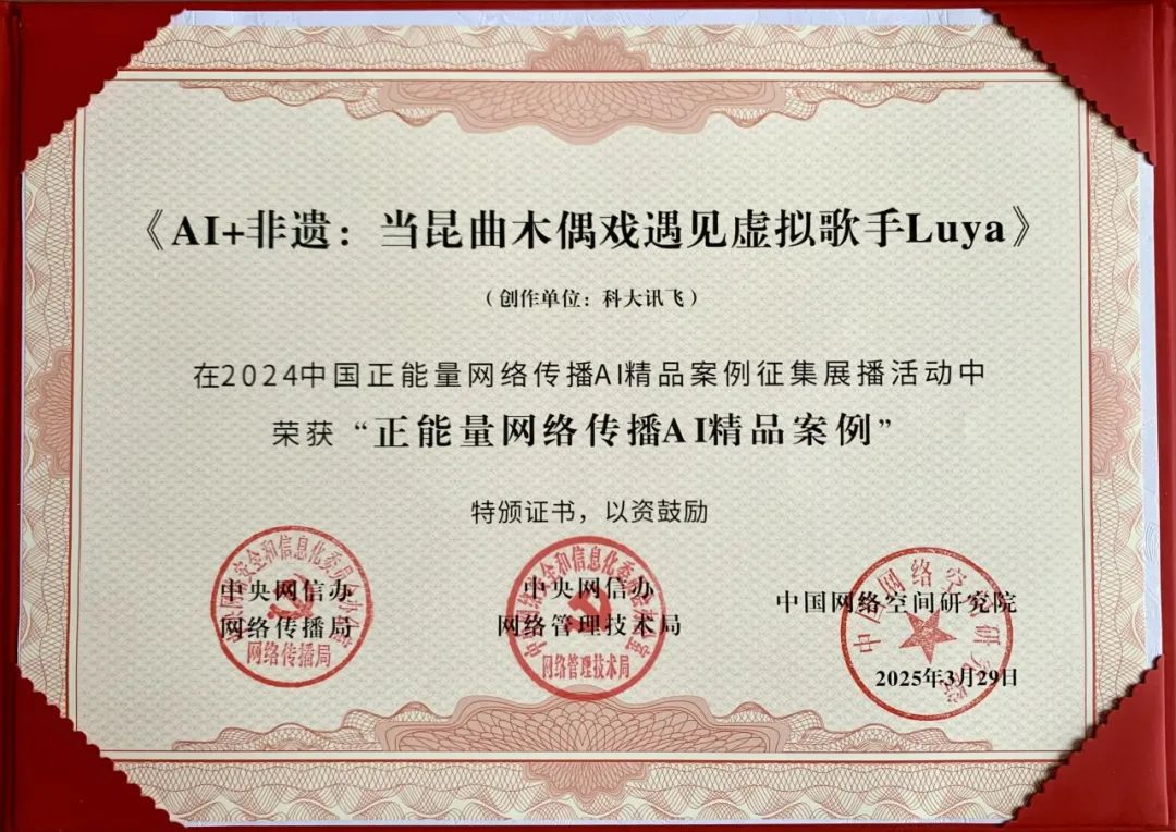 3/近日,中央网信办在广西举办2025中国网络媒体论坛。2024中国正能量网络传播AI精品案例征集展播活动、2024中国正能量网络精品征集展播活动分别揭晓入选结果,科大讯飞报送的2件作品入选。其中,由科大讯飞主创、安徽省委网信办选送的《AI+非遗:当昆曲木偶戏遇见虚拟歌手Luya》获评“正能量网络传播AI精品案例”;由科大讯飞主创、广东省委网信办报送的《听见,看见:汉字里的中国文化展》获评“网络正能量音视频优秀案例”。未来,科大讯飞将继续用AI技术赋能文化创新,打造更多正能量优质作品,持续为社会发展注入活力,带动更多人投身积极向上的网络文化建设,营造风清气正网络空间。