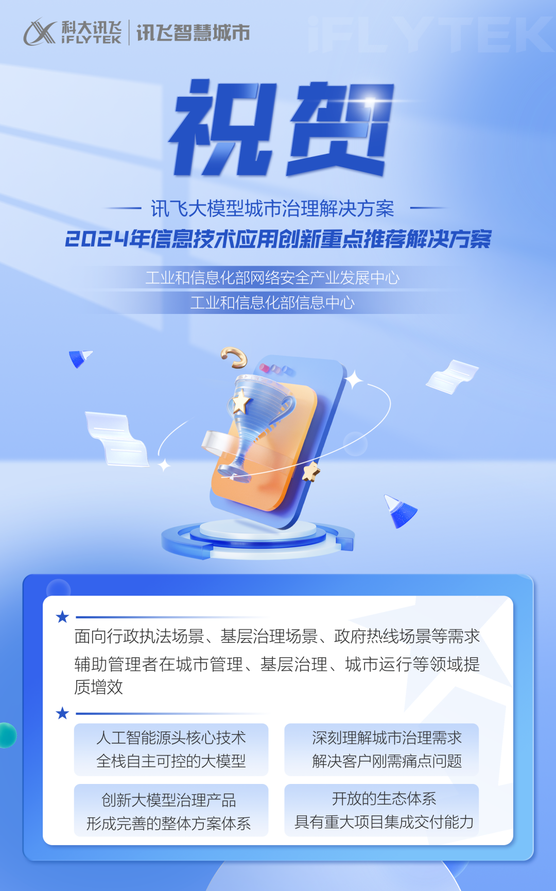 2/近日,由国家工业和信息化部网络安全产业发展中心举行的“2024年(第六届)信息技术应用创新解决方案征集工作”落下帷幕。由科大讯飞打造的“讯飞大模型城市治理解决方案”获得“2024信息技术应用创新重点推荐解决方案”。该方案面向政府热线场景、城市运行场景、行政执法场景、基层治理场景等需求,通过深度学习和数据分析,辅助管理者在民呼我应、城市管理、基层治理、应急管理、社会维稳、综合执法等关键领域做出更加科学、高效的管理,实现对城市复杂问题的快速响应和有效解决。目前方案已在湖北、四川、上海、天津等地区落地,推动城市治理体系现代化和城市治理能力质效提升。