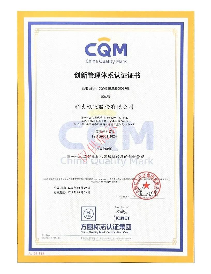 近日,科大讯飞通过ISO56001创新管理体系国际标准认证,成为国内人工智能行业首家获此认证的企业。这一标志性成果不仅体现了科大讯飞在创新战略布局、研发管理体系及成果转化能力等方面的出色表现,更标志着中国人工智能企业的创新管理水平首次获得国际权威认可。