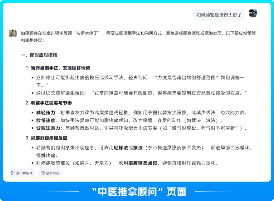 在成为程序员之前,李连才曾从事近10年的推拿工作,这段经历让他看到了行业中的问题:许多盲人推拿师专业知识薄弱、康复指导缺失。为此,他开发了第二个智能体“中医推拿顾问”,希望借助AI技术,为患者提供自我保健建议,同时帮助更多视障从业者成长为合格的推拿师。