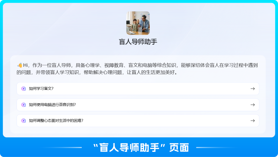 他的第三个智能体“盲人导师助手”源于亲身经历。初中时,李连才因视力突然下降被迫辍学,经历了从明亮到黑暗的巨大转变。“对于后天致盲的人群来说,突然间的失明是巨大的人生挑战。”他在这一智能体中融入心理学知识,为后天致盲者提供心理疏导,帮助他们学习读屏软件操作及盲文读写等生活技能。