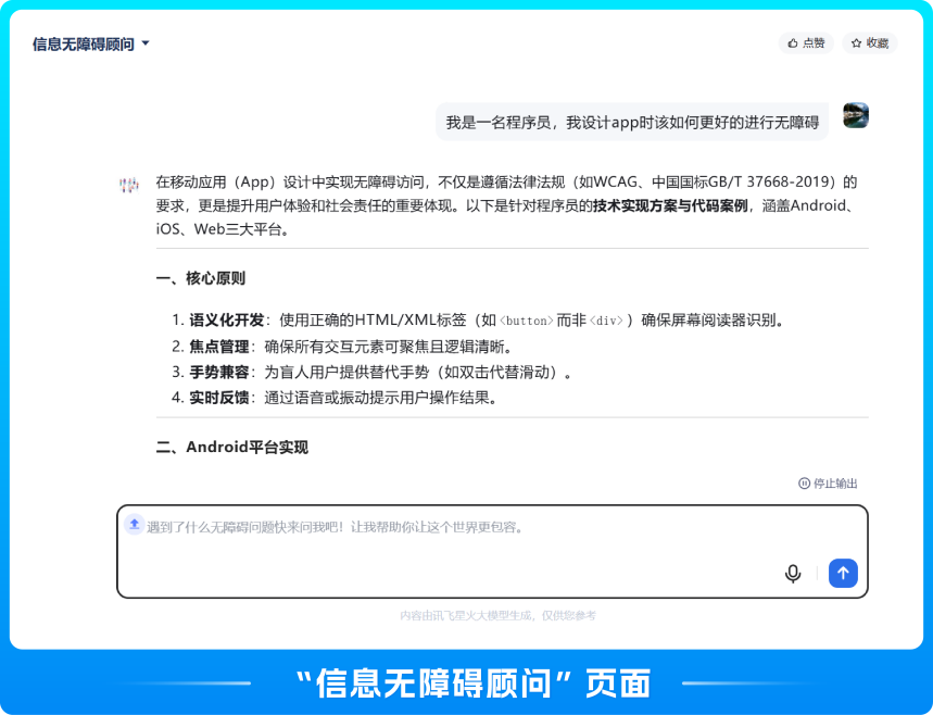 在讯飞星火智能体挑战赛中,李连才针对视障群体的实际需求,开发了三个智能体。第一个智能体“信息无障碍顾问”旨在解决视障者在数字化时代面临的障碍:许多网站未适配读屏软件,部分应用的验证码系统依赖视觉识别,将视障者排除在服务之外。这款智能体搭建了用户与开发者之间的沟通桥梁,让双方更顺畅地交流。