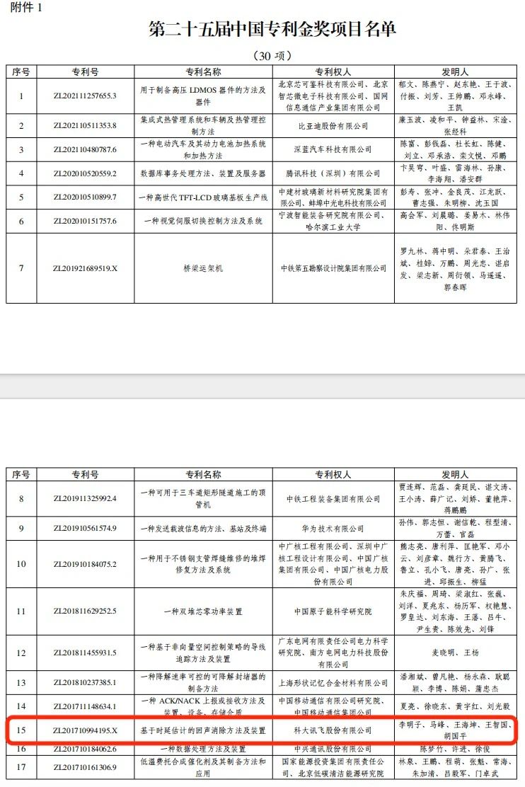 近日,国家知识产权局正式公布了第二十五届中国专利金奖项目名单,科大讯飞股份有限公司(以下简称“科大讯飞”)凭借“基于时延估计的回声消除方法及装置”专利入选。这是继获得第二十二届中国专利金奖之后,科大讯飞第二次获得这一国内知识产权领域的最高奖项,同时也是安徽省唯一一家两次获得中国专利金奖的单位。