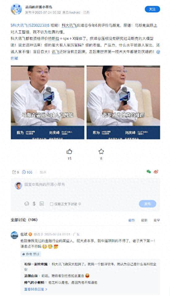 事情起源于刘庆峰此前的一次发言,他提到马斯克对人工智能的理解并不深入,这一言论迅速在网络上发酵。随后,一位名为“高尚的开源小翠鸟”的雪球用户发表了一篇帖子,对刘庆峰的评价表示强烈不满。该用户质疑道:“科大讯飞竟然有底气评价特斯拉?刘庆峰似乎并未深入研究过马斯克的大模型,就妄下结论。试问,科大讯飞的星火模型能与特斯拉的技术相提并论吗?市值、产品力又处于何种水平?这种盲目自大的态度实在令人费解!”并@了私募界知名人士但斌。