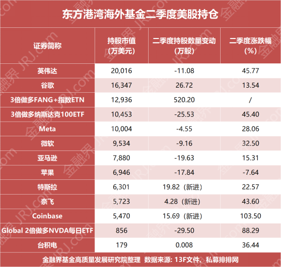 截至季度末,东方港湾海外基金前十大重仓股依次为:英伟达、谷歌C、3倍做多FANG+指数ETN、3倍做多纳斯达克100ETF、Meta、微软、亚马逊、苹果、特斯拉、奈飞。Coinbase、2倍做多英伟达每日ETF及台积电亦位列重要持仓。具体如下表所示: