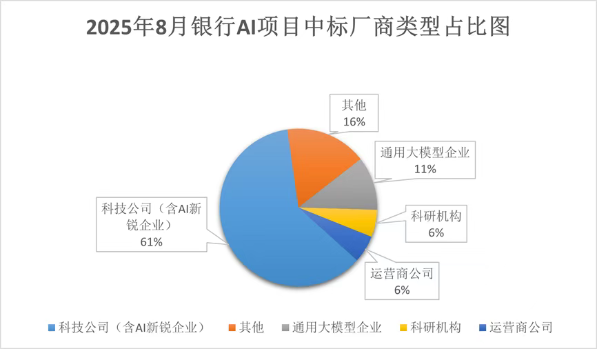 在银行业数字化转型进入深水区的当下,AI技术已从技术探索转向实际落地,成为银行提高竞争力的关键。在实际层面,通过银行开展的AI项目,可以一窥AI技术在银行业的最新进展。为此,本文梳理了2025年8月银行AI项目相关招标与中标信息,并从银行类型、AI项目类型、中标厂商类型三个维度展开分析。