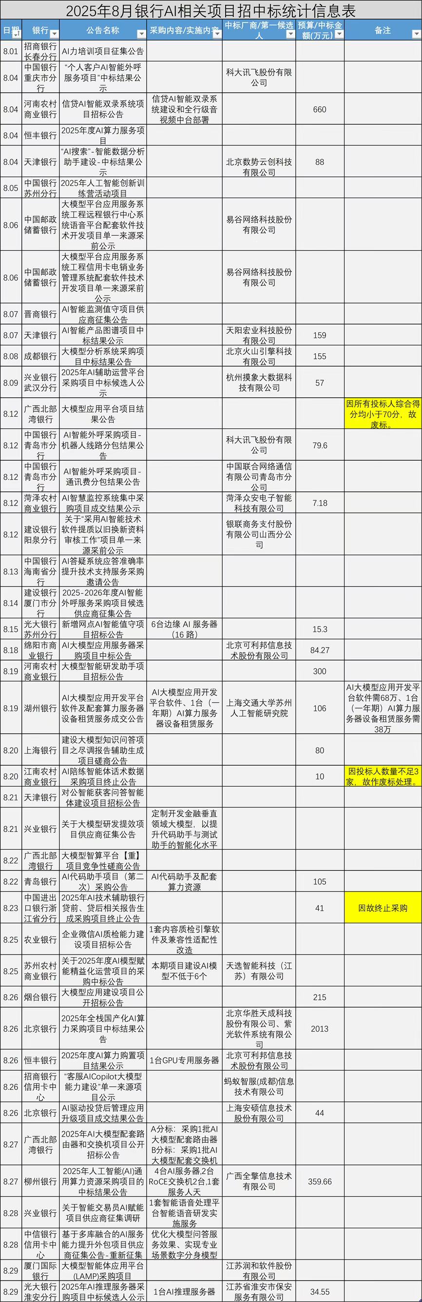 在废标方面,共有3家银行的相关项目遭遇波折:广西北部湾银行的大模型应用平台项目,因所有投标人综合得分均低于70分而废标;江南农村商业银行的AI陪练智能体话术数据项目,由于投标人数量不足3家被作废标处理;中国进出口银行浙江省分行的AI技术辅助银行贷前、贷后相关报告生成项目,因故终止采购。