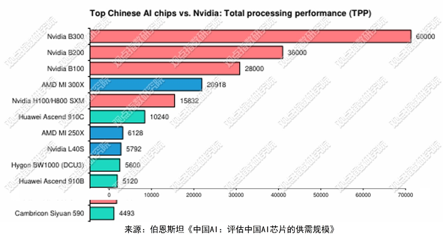 根据《中国AI:评估中国AI芯片的供需规模》研究报告显示,当前国内主流AI芯片中,单卡总处理性能(TTP)最高的华为昇腾910C芯片,其性能不到英伟达NvidiaB300芯片20%。同时,英伟达芯片迭代速度较快,从B100到B300,产品性能实现了翻倍提升。