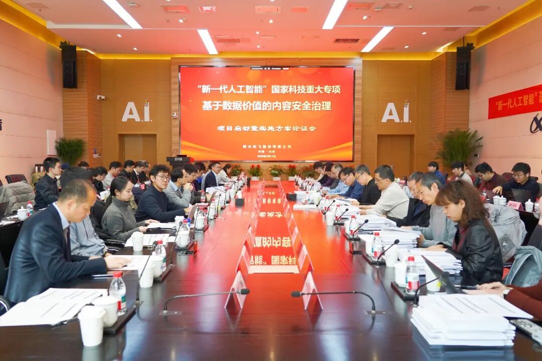 3月12日,由科大讯飞牵头承担的“新一代人工智能”国家科技重大专项——《基于数据价值的内容安全治理》项目启动暨实施方案论证会,在科大讯飞合肥总部召开。浦江实验室专项办公室常务副主任邱磊、安徽省科技厅人工智能科学技术处四级调研员许石君,以及来自杭州电子科技大学、浦江实验室、中关村实验室、华东师范大学、东南大学、中国科学技术大学、浙江大学、安徽大学、合肥工业大学等单位的专家学者,科大讯飞副总裁、研究院院长刘聪及项目骨干共50余人,通过线上线下相结合的方式齐聚一堂,共同参与本次会议,为项目启动与实施方案论证建言献策。