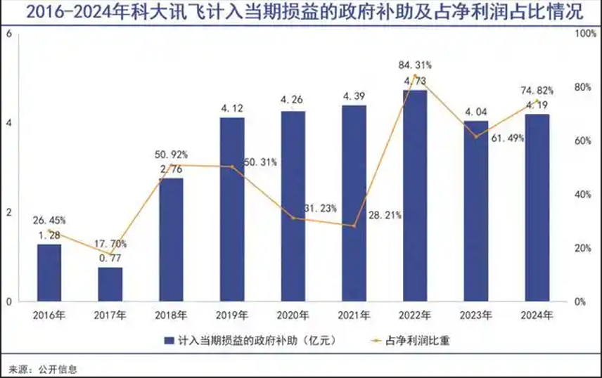 也就是说,最近三年,公司超过六成的归母净利润都来自政府补助,而非核心业务的盈利。若剔除这部分“输血”,科大讯飞实际上已连续多年处于亏损状态。