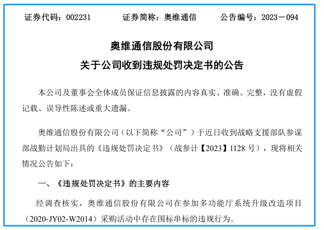 奥维通信(002231)10月30日晚公告,公司于近日收到战略支援部队参谋部战勤计划局出具的《违规处罚决定书》,经调查核实,奥维通信股份有限公司在参加多功能厅系统升级改造项目采购活动中存在围标串标的违规行为。给予奥维通信股份有限公司3年内禁止参加军队采购活动,其法定代表人李继芳控股或管理的其他企业3年内禁止参加军队采购活动,其项目代理人张道纲3年内禁止代理其他供应商参加军队采购活动的处罚,自 2023 年 10 月 13 日起生效。