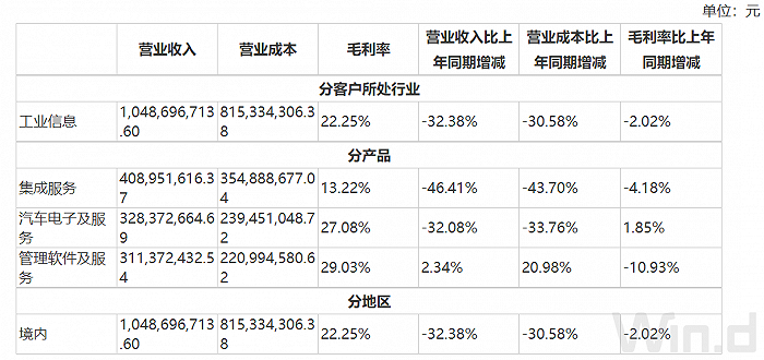 年报中细分业务可以看到,2021年启明信息营收10.51亿元,其中集成服务营收4.09亿元、占比38.9%;汽车电子与服务营收3.28亿元、占比31.24%;管理软件及服务营收达3.11亿元、占比29.62%;其他业务营收249.57万元、占比0.24%。公司还是以软件和集成服务方向为主,汽车电子等硬件为辅。从年报中可以看到,无论是公司整体营收还是细分业务产品营收,毛利都在下降。