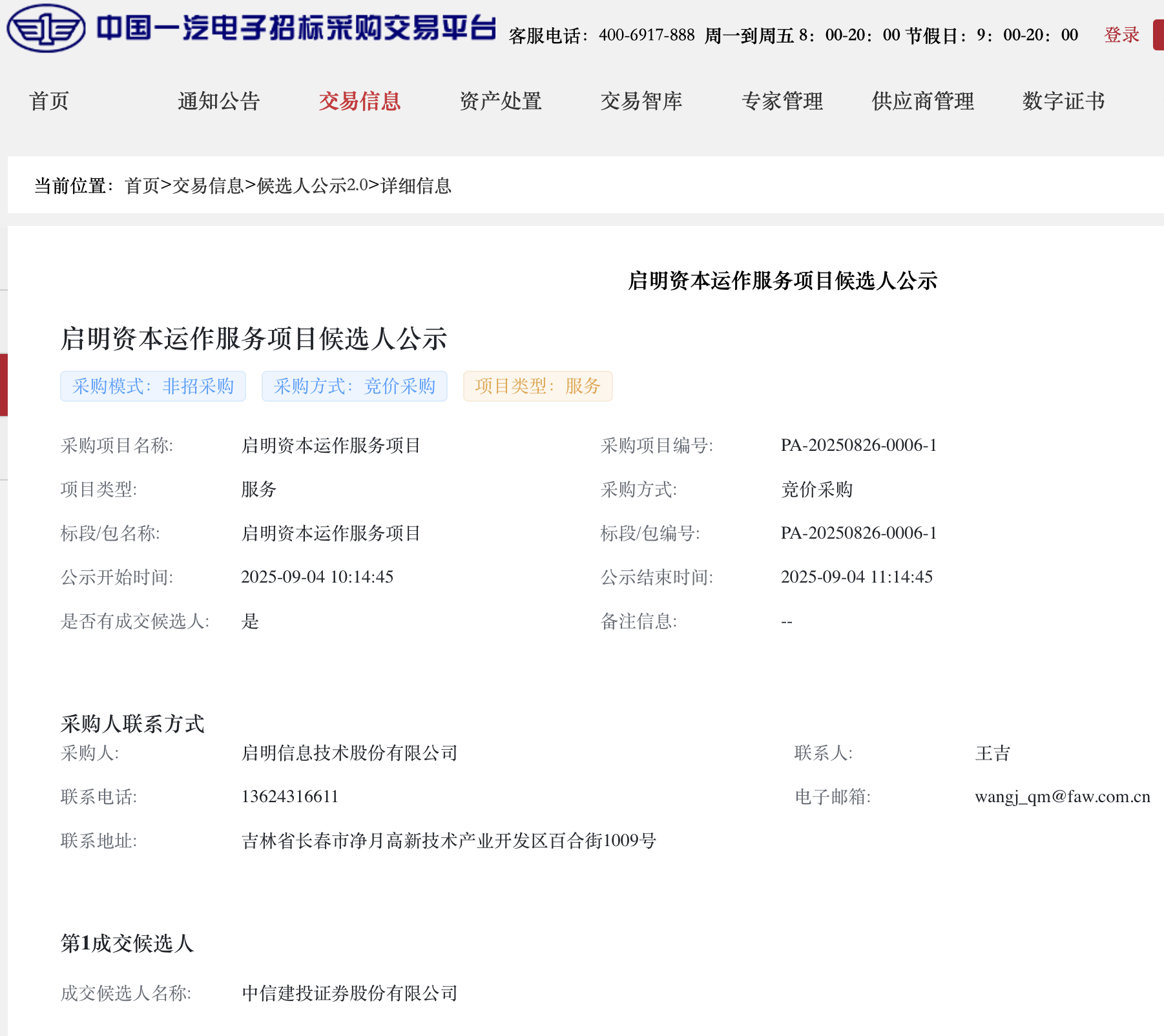 9月4日,中国一汽电子招标采购交易平台发布《启明资本运作服务项目候选人公示》。采购人为启明信息技术股份有限公司。第一成交候选人为中信建投证券股份有限公司。