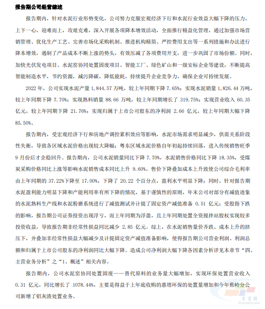 综上,在水泥销售量价齐跌、成本上升的挤压下,并叠加非经常性损益大幅减少及计提固定资产减值准备影响,使得报告期公司营业利润、利润总额和归属于上市公司股东的净利润同比大幅下降。