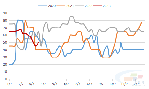 图3:2020-2023年春节后广东水泥发运率情况(%)