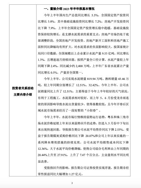 答:主要是上年基数较低的原因,上年5、6月份受龙舟雨连续的原因影响,导致上年同期水泥出货量较少,使得基数相对较低,上年同期公司销量下降幅度是大于同行业平均水平的。今年广东天气状况相对较好,所以今年上半年广东水泥产量同比是增长0.5%的,也是好于上半年全国水泥产量(全口径计算)较上年同期下降2.4%的水平。此外,公司加强了市场端管控和建设,科学应对,精准施策,也进一步巩固公司市场份额。