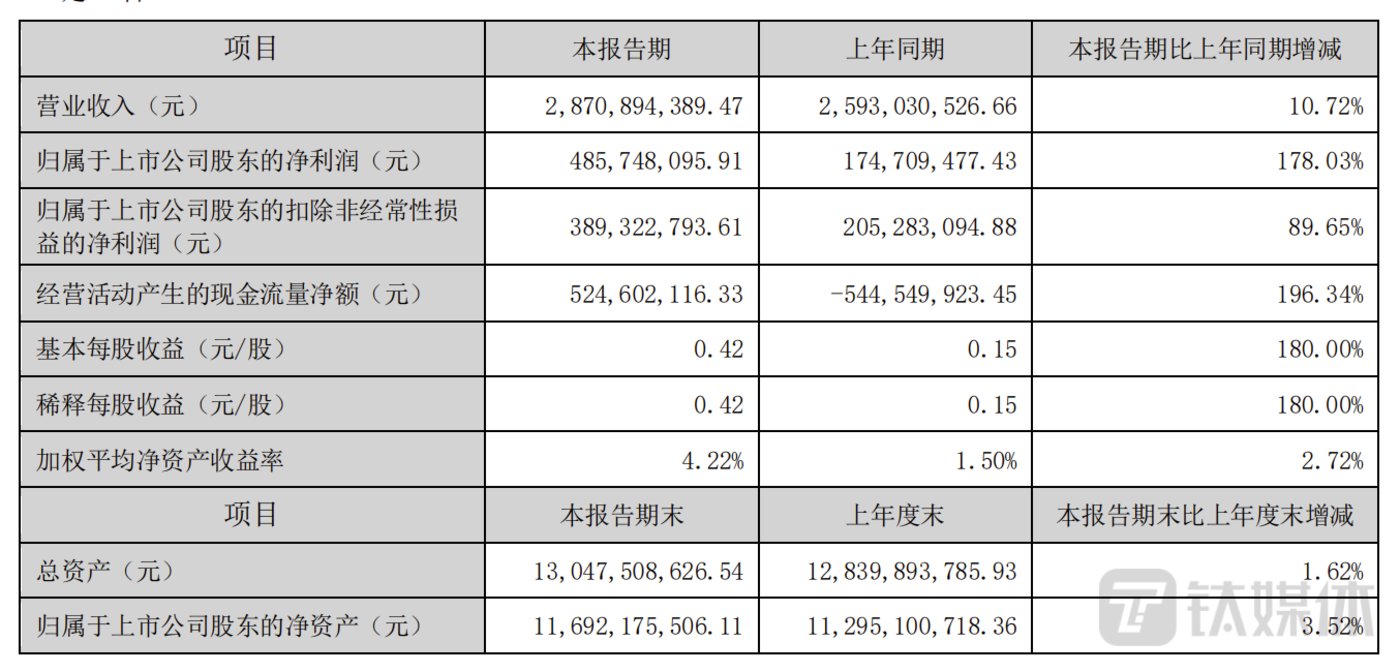 报告期内,公司实现营收约28.71亿元,同比增加10.72%;实现归母净利润约4.86亿元,同比增加178.03%;扣非净利润约3.89亿元,同比增加89.65%;基本每股收益0.42元,同比增加180%。公司在上半年实现营利双增。
