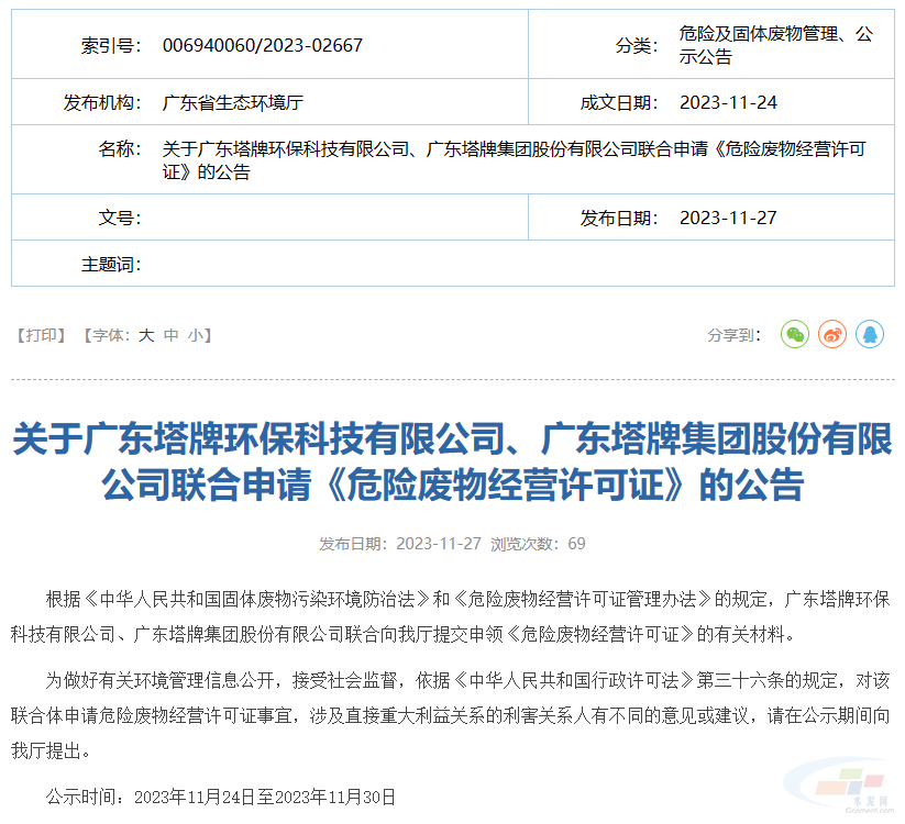 近日,广东省生态环境厅发布关于广东塔牌环保科技有限公司、广东塔牌集团股份有限公司联合申请《危险废物经营许可证》的公告。根据《中华人民共和国固体废物污染环境防治法》和《危险废物经营许可证管理办法》的规定,广东塔牌环保科技有限公司、广东塔牌集团股份有限公司联合向广东省生态环境厅提交申领《危险废物经营许可证》的有关材料。