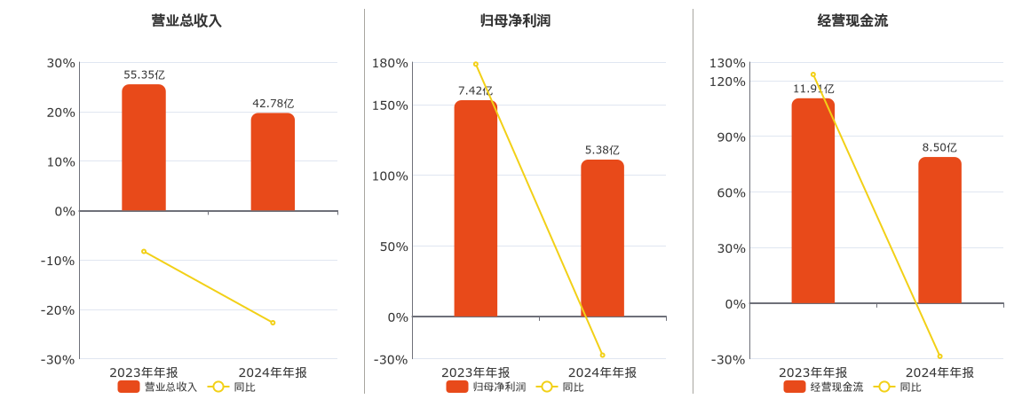 公司营业总收入为42.78亿元,较去年同报告期营业总收入减少12.57亿元,同比较去年同期下降22.71%。归母净利润为5.38亿元,较去年同报告期归母净利润减少2.04亿元,同比较去年同期下降27.46%。经营活动现金净流入为8.50亿元,较去年同报告期经营活动现金净流入减少3.42亿元,同比较去年同期下降28.67%。