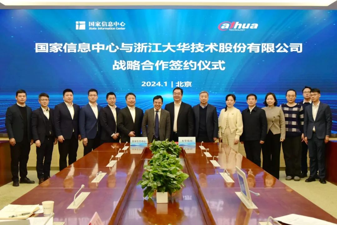 1月23日,大华股份与国家信息中心在北京举行战略合作协议签约仪式。国家信息中心主任徐强、大华股份董事长兼总裁傅利泉出席签约仪式。国家信息中心副主任周民与大华股份副总裁、国内营销中心总裁郜春山代表双方签署战略合作协议。