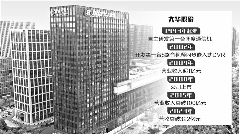 大华1993年起步,自主研发第一台调度通信机;2002年,开发第一台8路音视频同步嵌入式DVR;2004年,营业收入超1亿元;2008年,大华股份上市;2015年,营业收入突破100亿元;2023年,营收突破322亿元……
