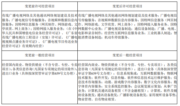 其中“变更后许可经营项目”即“有线广播电视网络及其他通讯网络规划建设及技术服务;广播电视信号传输服务;音视频和数据信息内容服务;因特网信息服务(网页制作、网络游戏、文学欣赏、网上商务);因特网接入服务业务、因特网数据中心业务;广播电视设备制造;通信设备制造;广播、电视、电影和录音制作;经营性互联网信息服务业务;工业机器人制造;智能消费设备制造;机动车停放服务等”并需依法取得电信部门、市文体旅游局、市公安局、工业和信息化部、国家新闻出版广电总局、市人居环境委审批文件后方可经营。