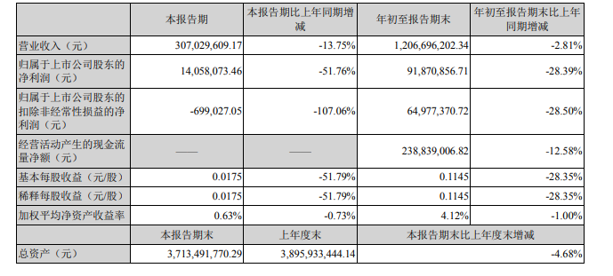 其中,2021年第三季度,公司实现营业收入3.07亿元,同比下降13.75%;归属于上市公司股东的净利润1405.81万元,同比下降51.76%。