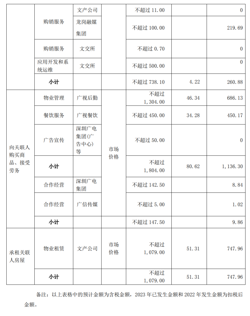 12)宜和公司拟与深圳广电集团签订《集团呼叫服务采购协议》,协议拟约定:为扩大深圳广电集团电视、广播的收视收听率,扩大广电媒体的传播力、影响力和社会美誉度,宜和公司为深圳广电集团提供呼叫服务,深圳广电集团统筹采购热线新闻报料服务项目,全部费用由深圳广电集团负责,供深圳广电集团各频道、频率免费使用。由宜和公司为各频道、频率每个栏目宣传集团统一客服热线33311111,宜和公司为深圳广电集团所属频道频率做好观众来电服务,保持服务热线畅通,及时、准确整理信息提交给深圳广电集团;热线服务的内容和互动形式由各频道、频率提供,宜和公司负责技术支持与客户平台维护;各频道、频率须将热线服务需求提前3个工作日以电子文件形式提交给宜和公司,宜和公司提供相关服务,本协议期限拟为2023年1月1日至2023年12月31日。预计2023年发生金额不超过260万元。