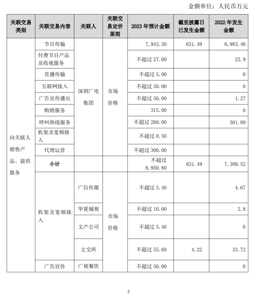 1)拟与深圳广电集团签订《电视节目落地传输服务2023年度协议》,协议拟约定:2023年度境内和境外频道的节目传输费价格分别为人民币121万元/频道和385万元/频道,2023年度天威视讯传输深圳广电集团自办电视节目频道8套,买断经营(销售)落地传输业务的电视频道33套(其中境外电视节目频道5套,境内电视节目频道28套),收取传输费6281万元;同时,新增传输9套高清频道,深圳广电集团向天威视讯支付维护费共计15.3万元。