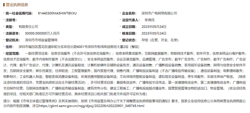 5月26日,深圳市天威视讯股份有限公司发布通告确认,前些日子拟定的整合广电有线业务资产(含负债)而决定出资设立的全新子公司——深圳市广电网络有限公司(以下简称为“深圳广电网络”)已经完成了工商登记手续并取得了深圳市市场监督管理局颁发的《营业执照》。