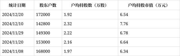 从12月26日公开信息显示,奥特佳截至2024年12月20日公司股东户数为17.20万户,较上期(2024年12月10日)增加2.92万户,增幅为20.45%,持股趋于分散。