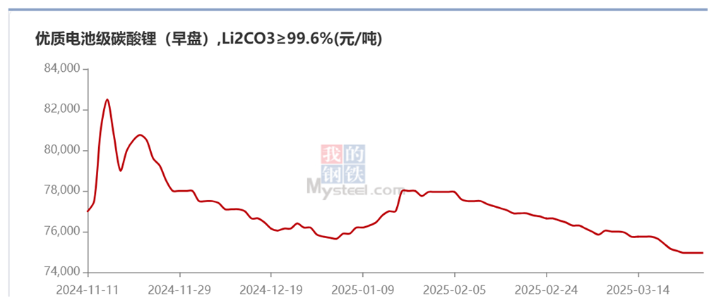 从市场数据来看,锂盐市场的悲观情绪仍在延续。3月21日公司年报发布当天,碳酸锂期货合约2505持续下跌,创碳酸锂期货上市以来新低,最低价格触及72420元/吨。现货电池级碳酸锂报价为74300元/吨,周跌幅为0.54%。
