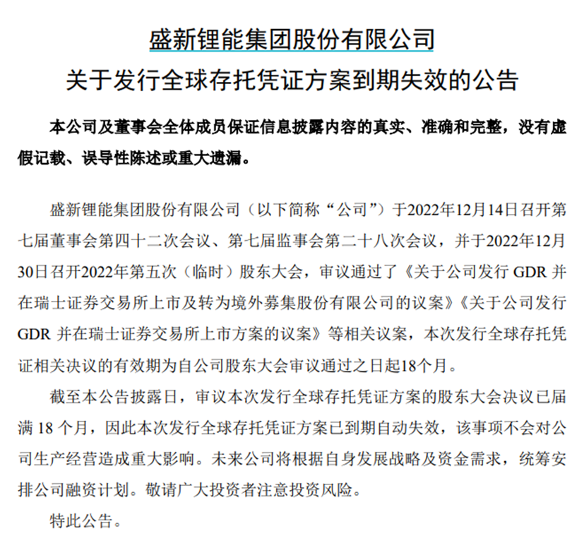 2023年在锂价暴跌的背景下,盛新锂能开始推进GDR(全球存托凭证)的发行,当时公司高管在投资交流会上表示,本次申请发行GDR有助于提高公司的锂产品生产规模,同时也有利于优化公司资本结构,满足营运资金需求。然而,截至2024年7月1日,盛新锂能本次发行全球存托凭证方案已到期自动失效。