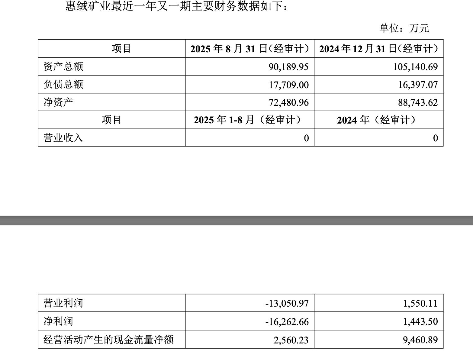 然而,这座被寄予厚望的矿山目前尚未产生营收。截至2025年8月底,惠绒矿业净资产为7.25亿元,2024年、2025年1—8月份,惠绒矿业的营收为0元,净利润分别为1443.50万元、-1.63亿元,经营现金流净额分别为9460.89万元、2560.23万元。