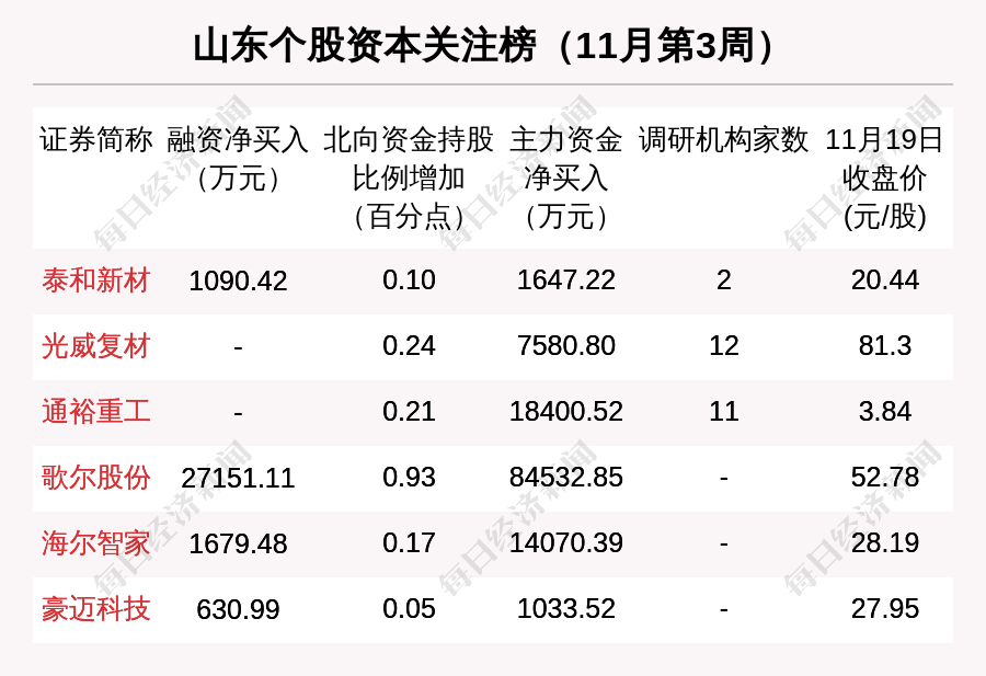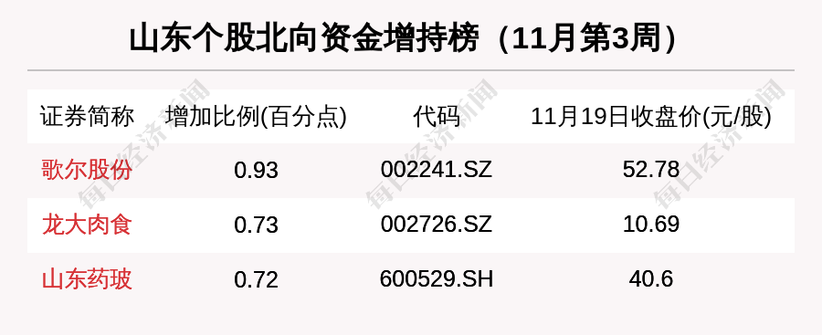 再看北向资金,11月第3周,歌尔股份北向资金持股比例增加0.93个百分点,龙大肉食北向资金持股比例增加0.73个百分点,山东药玻北向资金持股比例增加0.72个百分点。