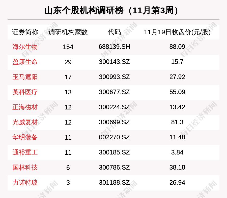 机构调研方面,据数据统计,11月第3周,有14家山东上市公司接受机构调研。其中,154家机构到访海尔生物,29家机构到访盈康生命,17家机构到访玉马遮阳,13家机构到访英科医疗,12家机构到访正海磁材。