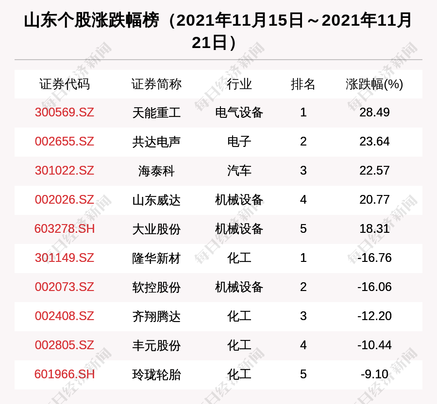 从涨跌幅来看,上周涨幅最大的山东公司是天能重工,上涨幅度为28.49%。跌幅最大的是隆华新材,下跌幅度为16.76%。