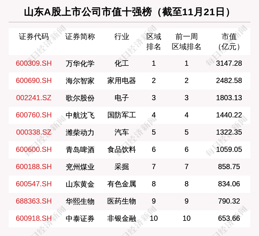 万华化学市值3147.28亿元,稳居山东股市值榜首