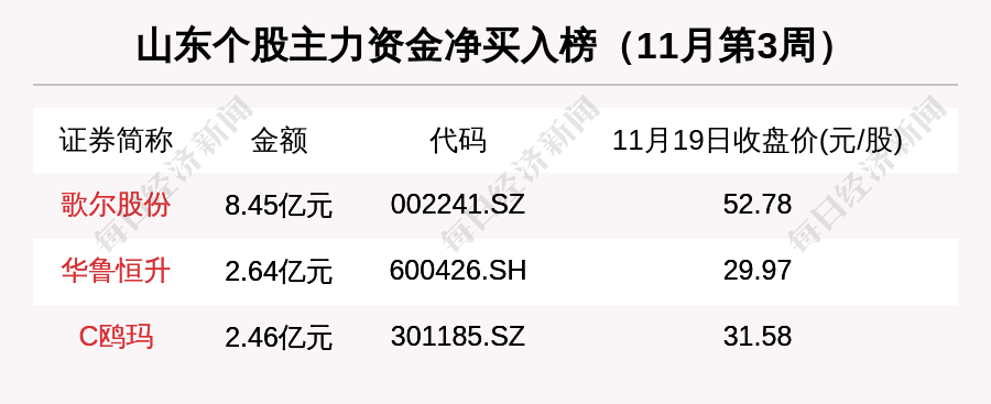 主力资金方面,11月第3周,歌尔股份净买入额居首位,为8.45亿元,其次是华鲁恒升(2.64亿元)和C鸥玛(2.46亿元)。