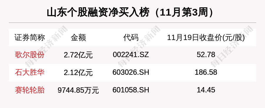 先看融资资金,11月第3周,山东板块融资净买入总额为2.10亿元。融资净买入最多的山东股是歌尔股份,金额是2.72亿元。其次是石大胜华(2.12亿元)和赛轮轮胎(9744.85万元)。