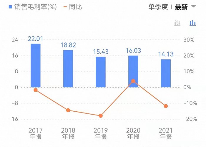 界面新闻注意到,尽管报告期内歌尔股份营收、净利实现双增,但销售毛利率却呈现下降趋势。其中,2021年的销售毛利率同比下降11.87%至14.13%,这也是自2005年公司公开经营业绩数据以来的新低。