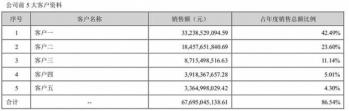 值得一提的是,2021年歌尔股份的前五大客户合计销售金额达到676.95亿元,占年度销售总额的86.54%。其中,客户一带来的销售金额更是达到332.39亿元,占年度销售总额的42.49%,较上一年的48.08%有所下降。