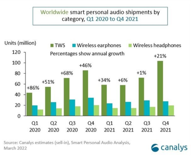 其背后的主要原因,是在过去的5年里,TWS耳机的出货量呈现爆发式增长,最近的增长空间十分有限。