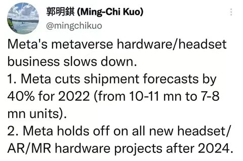 封住跌停后,一则消息传出。天风国际证券分析师郭明錤早间在推特发文称,Meta的元宇宙硬件、头显业务放缓,将2022年元宇宙硬件的出货量预测削减了40%,从1000万-1100万降至700万-800万。此外,Meta还推迟了2024年之后的所有新头显/AR/MR硬件项目。