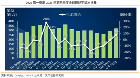基本面来看,根据IDC公布的报告,2023年全球智能手机出货量创下10年来出货量最低。由于中国、印度等新兴市场成功扭转颓势,从2023年第四季度起成为智能手机市场的新增长引擎。市场调研机构Canalys报告显示,2023年第四季度,全球智能手机市场增长8%,达到3.2亿部。