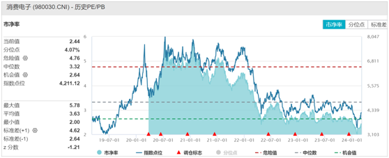 值得注意的是,消费电子ETF跟踪国证消费电子主题指数(980030.CNI)选取公司业务领域属于消费电子板块,包括手机产业链、可穿戴智能设备、智能家居等细分领域的上市公司中日均总市值前50名证券作为指数样本,反映沪深北交易所消费电子行业优质上市公司的市场表现。从估值角度看,消费电子指数最新估值市净率2.44倍,低于近五年96%以上的时间,估值性价比突出。同时,场外基金账户可布局华夏国证消费电子主题联接(A类:018300,C类:018301)。