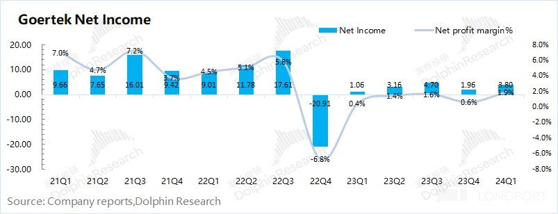 2024 年第一季度公司净利率回落至 1.9%,有所回升,但仍在低位。公司主要收入来自于智能声学整机和智能硬件,而两者的毛利率都滑落到个位数。个位数的毛利率,公司的净利率只能维持在盈亏平衡线的附近。