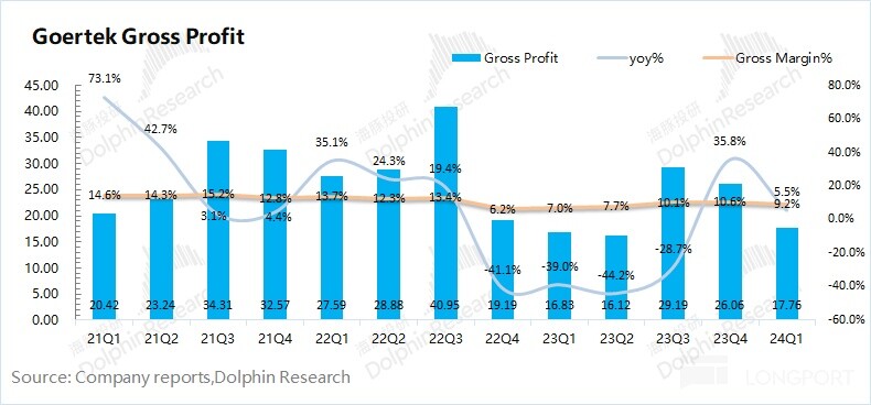 歌尔股份 2024 年第一季度实现毛利 17.76 亿元,同比增长 5.5%。在收入下滑的情况下,毛利率端仍在增长,主要得益于公司毛利率的提升。