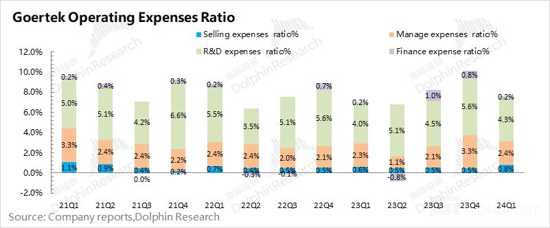 2024 年第一季度歌尔股份四项费用合计 14.7 亿元,同比减少 13.4%。四项费用率 7.6%,四项费用率的下滑主要来自管理费用和研发费用的减少。