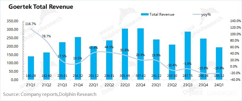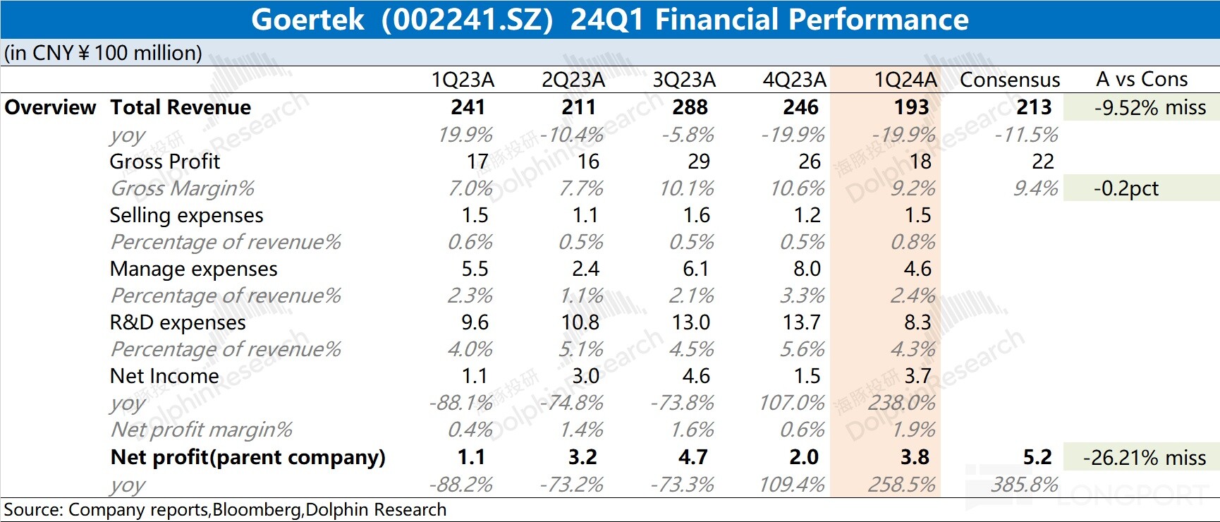 歌尔股份 2024 年第一季度总营收 193.12 亿元,同比下滑 19.9%,低于市场预期(213 亿)。公司营收继续保持下滑的态势,主要是受智能硬件端需求不足的影响。